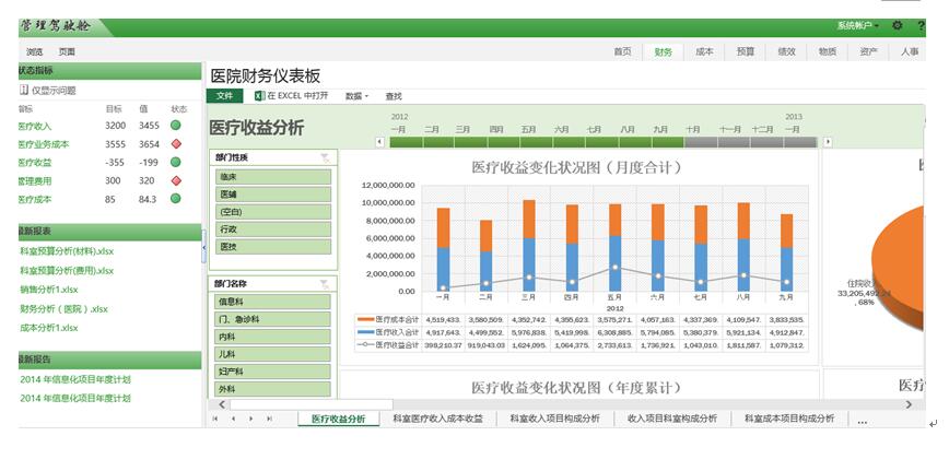 关键指标监控(KPI):关键指标监控是对医院业务指标实时的监控和预警功能。KPI借助表格和图形方式直观的展现使得管理者能以宏观的角度及时了解现有医疗收入、管理费用以及和同期发展的比较,以微观的角度了解具体某个科室的收入和支出具体情况。